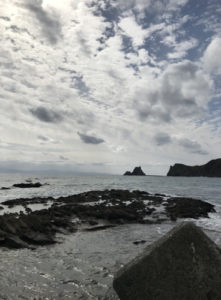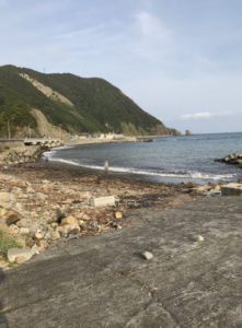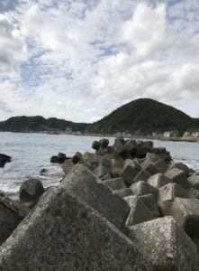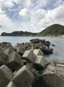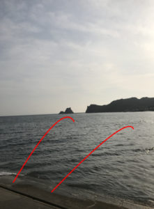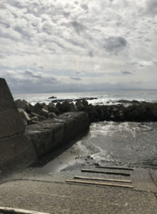 この釣り場の一番人気のポイント。釣果を期待したいなら、消波ブロック帯上か、干渉時に露出する岩盤上のポイントだが、その場合はウェーダなどが必要になるため、多くの釣り人は船揚場から釣っている。