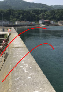 ここは胸壁の裏には消波ブロック帯などが無く、投げやすいので
